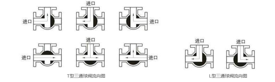 氣動三通球閥根據結構形式及流通方向不同分為L型和T型,介質流通方向圖(tú)如下(xià)。