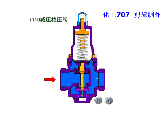 安裝於管路中,主要穩定出口壓在設定範圍,保(bǎo)證出口壓力(lì)不因進口壓力的變化而變化,當出口壓力低(dī)於設定值時,閥瓣在彈簧(huáng)力(lì)的作用打開,水流通過,當出口壓力升至設(shè)定值時,出口壓直接傳遞(dì)於膜片(piàn)下方,與彈簧形成對抗(kàng)使閥瓣關(guān)閉,切斷通水。