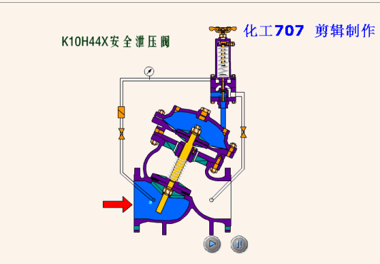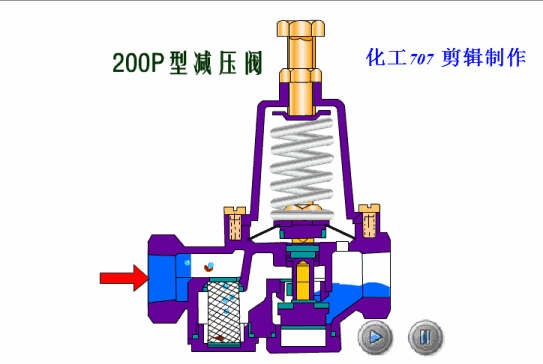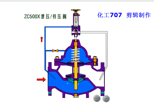 該閥安裝於管路中,主要穩(wěn)定出口壓在設(shè)定的範圍,保證出(chū)口的壓力不(bú)因進口壓力的變化而變化,當出口壓力低於設(shè)定值時,閥瓣在彈(dàn)簧力的作用下(xià)打開,水流通過,當出口壓達到設定值時,出口壓(yā)直接傳遞與膜片下方,與彈簧形成對抗,使(shǐ)閥瓣關閉切斷通水。