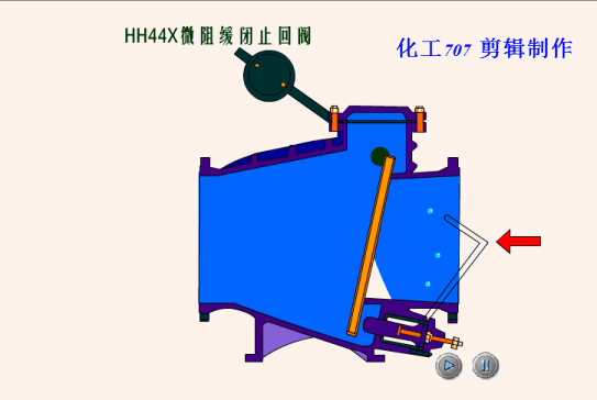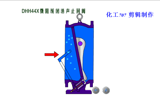 在閥(fá)門用於止排水管道,安裝在水(shuǐ)泵出口處(chù),用來防止介質倒流(liú)或消除破壞性水錘,當水泵開始工作或防止壓力開始升高時。閥瓣在進口壓力作用下打開,介質大量通過,同時介質進入管壁氣缸內,使活塞運動到工作(zuò)位置,當水泵停止或(huò)進口壓力下降時,閥瓣在回水壓(yā)力作用下(xià)在先(xiān)快速關閉(bì)百分之九(jiǔ)十,由於活塞處於工作位置,剩百分之十左右的關閉形成,由活塞組織(zhī)緩慢(màn)關(guān)閉,從而消除了快速關閉所形成的水錘。