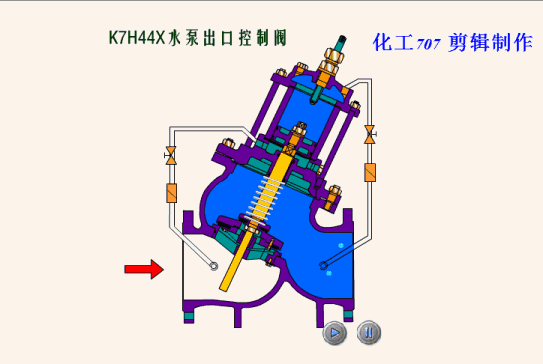 該閥安裝於管路中,主要控製水泵停水時阻止介質逆流,並阻止因介質逆流(liú)所產生的水錘(chuí),保證水泵安全停泵,當水泵工作(zuò)時,電磁閥通電處於關閉(bì)狀態,主閥上控製室內的壓力水經出(chū)口處單(dān)向閥流向下遊,主閥瓣處於輕鬆工作中,當開始停泵時,主閥瓣再回流水的作用下快速關閉百分之九十,主控製室內的壓力水由進口端補給,此時電(diàn)磁閥的(de)在形成開關的控製失電(diàn)下被打(dǎ)開,控製內的壓力水由出口端緩慢補給,從而使(shǐ)主閥瓣的剩餘百分之十開(kāi)度緩慢關閉(bì),消除破壞性水錘。