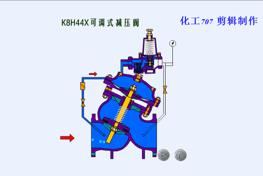 該閥安裝於管路中,主要穩定出口壓在設定範圍,保證出口壓力(lì)不因進口壓力的變(biàn)化而變化,當(dāng)出口壓力低於設定值時,閥瓣在彈簧力的作用打開(kāi),水流通過,當出口壓力升至設定值時,出口壓直接傳遞於膜(mó)片下方,與彈簧形成對抗使閥瓣關閉,切斷通水。